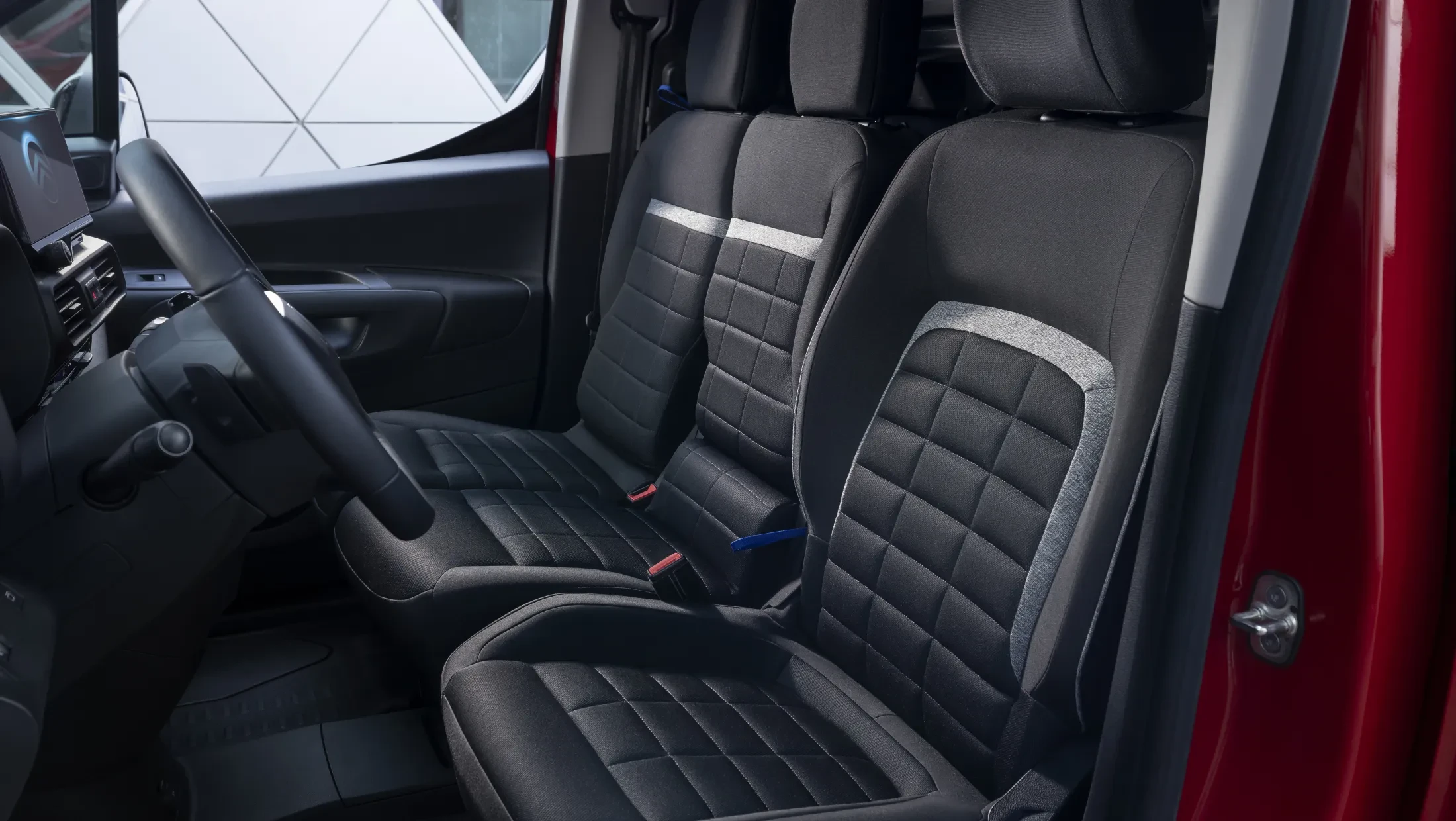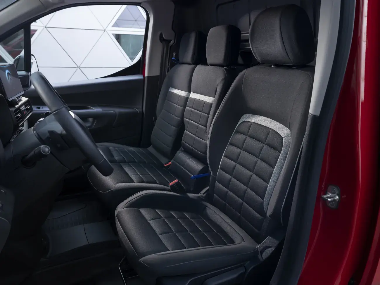 Het nieuwe digitale instrumentenpaneel van de bedrijfswagen bevat innovatieve infotainmentsystemen die eenvoudig te bedienen zijn via het 10-inch touchscreen. Bovendien beschikt de achteruitkijkspiegel over verbeterde Dynamic Surround Vision als extra set ogen. Om een volledig beeld te krijgen van de omgeving rondom de auto, is de nieuwe ë-Berlingo Van voorzien van twee camera's: één boven de achterdeuren en één onder de rechterbuitenspiegel. Het camerabeeld wordt direct weergegeven op de centrale achteruitkijkspiegel en biedt, ondanks de afgesloten laadruimte, een goed overzicht van alles wat er achter de auto gebeurd. Op parkeerplaatsen compenseert het beeld de dode hoeken van de auto.