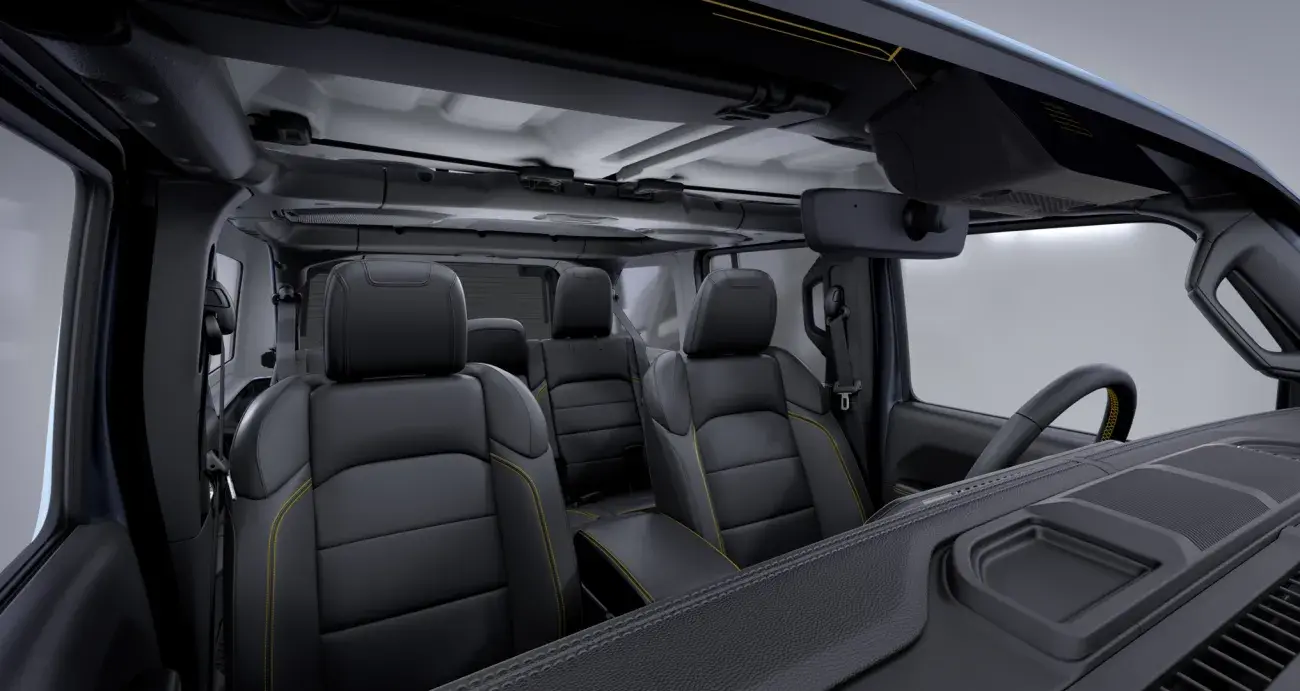 Het interieur is uitgerust met een strakke middenconsole en het instrumentenpaneel heeft nieuwe soft-touch oppervlakken, in stof of polyurethaan, met contrasterende stiknaden. Deze 4-zits terreinwagen is zeker veelzijdig, onder andere door een neerklapbare voorruit, verschillende dakconfiguraties en uitneembare deuren voor de ultieme openluchtervaring. De Jeep heeft veel ruimte voor alle passagiers aan boord plus waterdichte en afsluitbare opbergvakken in het interieur. Bovendien is het volledige interieur eenvoudig te reinigen na een outdoor avontuur.