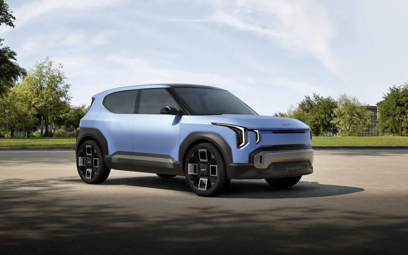 Kia bewandelt met de Concept EV2 een frisse, eigenzinnige weg, waarbij innovatie en gebruiksgemak centraal staan. Met zijn slimme technologie, doordacht design en verrassend ruim interieur is de EV2 een compacte SUV die perfect past bij een moderne, stedelijke levensstijl. De Concept EV2 heeft een opvallend uiterlijk met een zelfverzekerde uitstraling. De compacte SUV combineert strakke lijnen met robuuste details, zoals een krachtige voorzijde en een brede, stevige achterzijde. De unieke verlichting en slimme aerodynamische vormen dragen bij aan een moderne en dynamische look. De achterdeuren met scharnieren aan de achterkant zorgen voor een brede instap en extra gebruiksgemak.